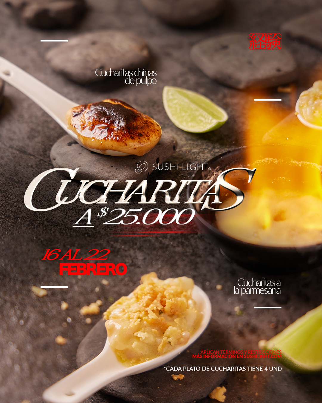 Del 16 al 22 de febrero ven a todos nuestros restaurantes y disfruta de esta promoción: Nuestras cucharitas chinas de pulpo y cucharitas a la parmesana estarán a un precio especial: ¡$25.000! 😱