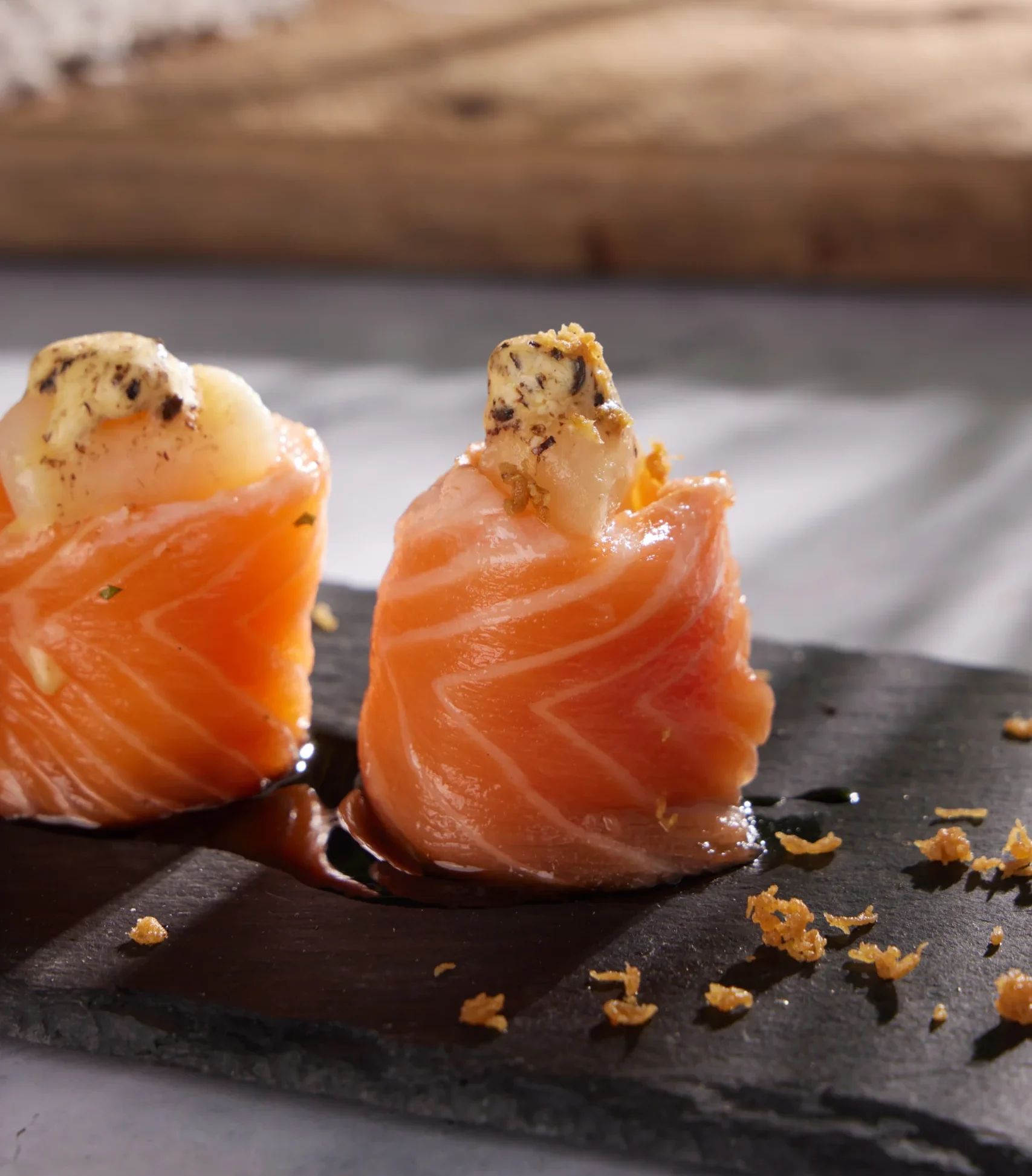 Salmon, scallops, and truffle butter au gratin, shrimp tenkasu, truffle butter, sushi rice, and eel sauce.