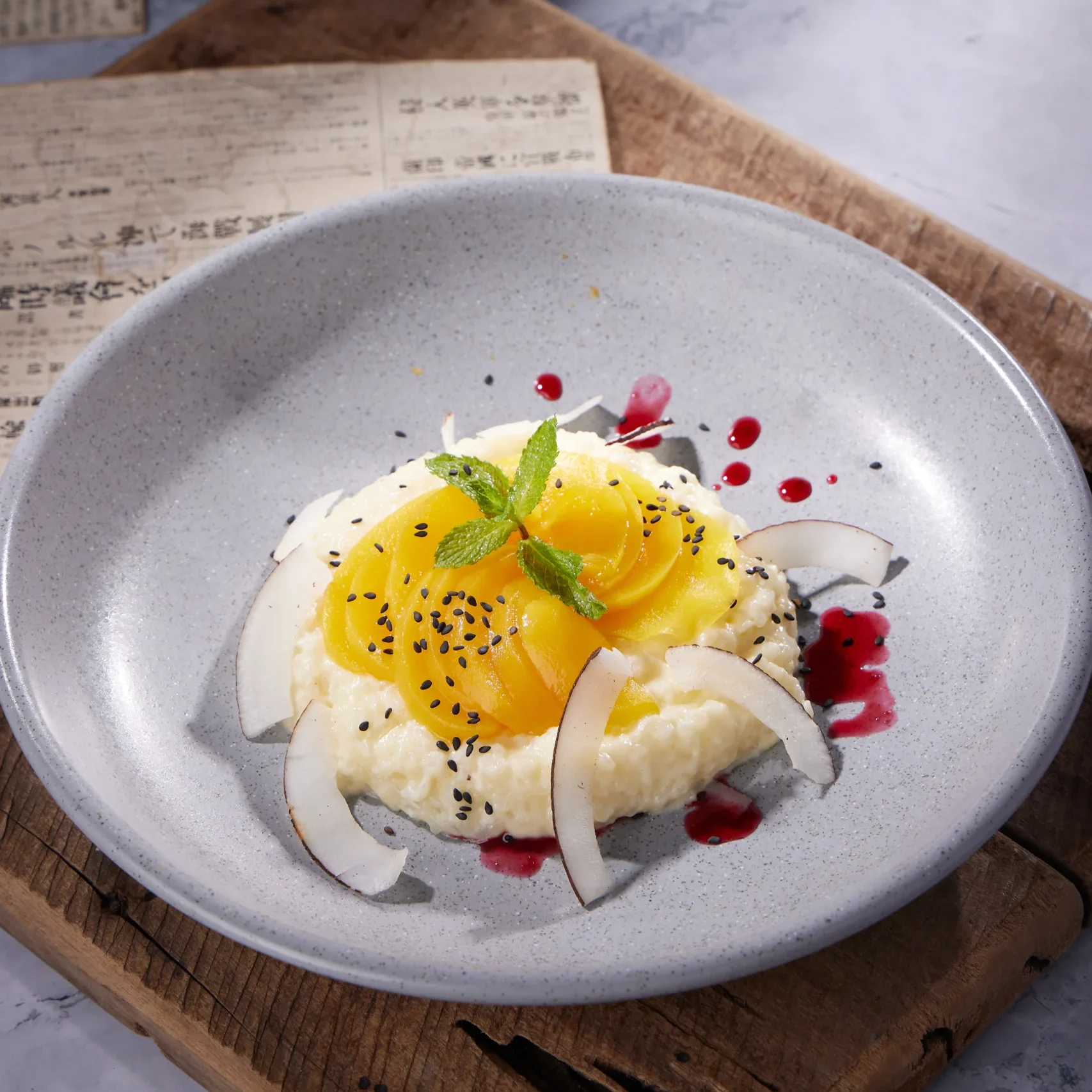Arroz glutinoso, leche de coco, duraznos, coco deshidratado, hierbabuena, ajonjolí negro y salsa de mora.